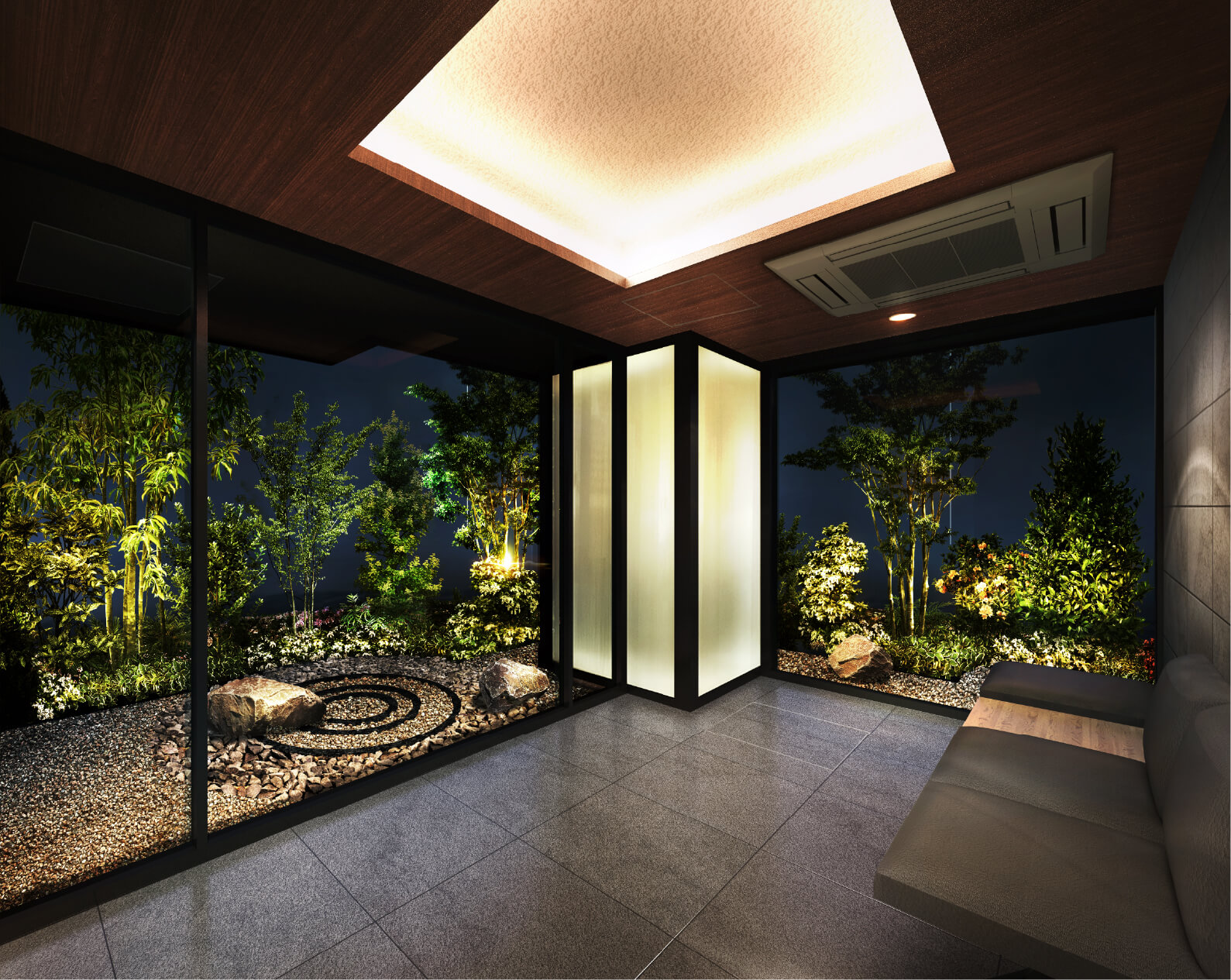 窓外に広がる景石が置かれた庭園や四季の植栽を愉しめます。