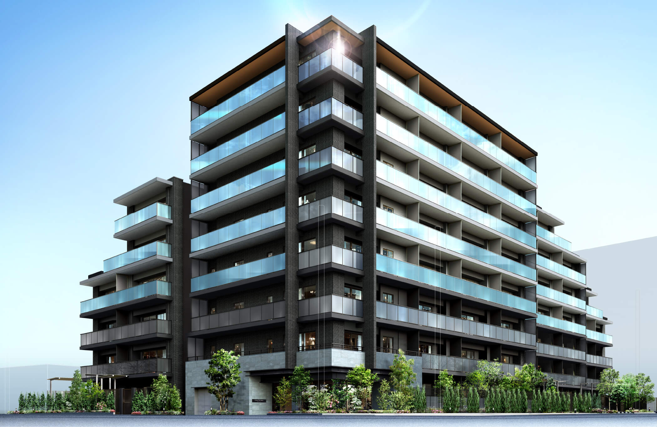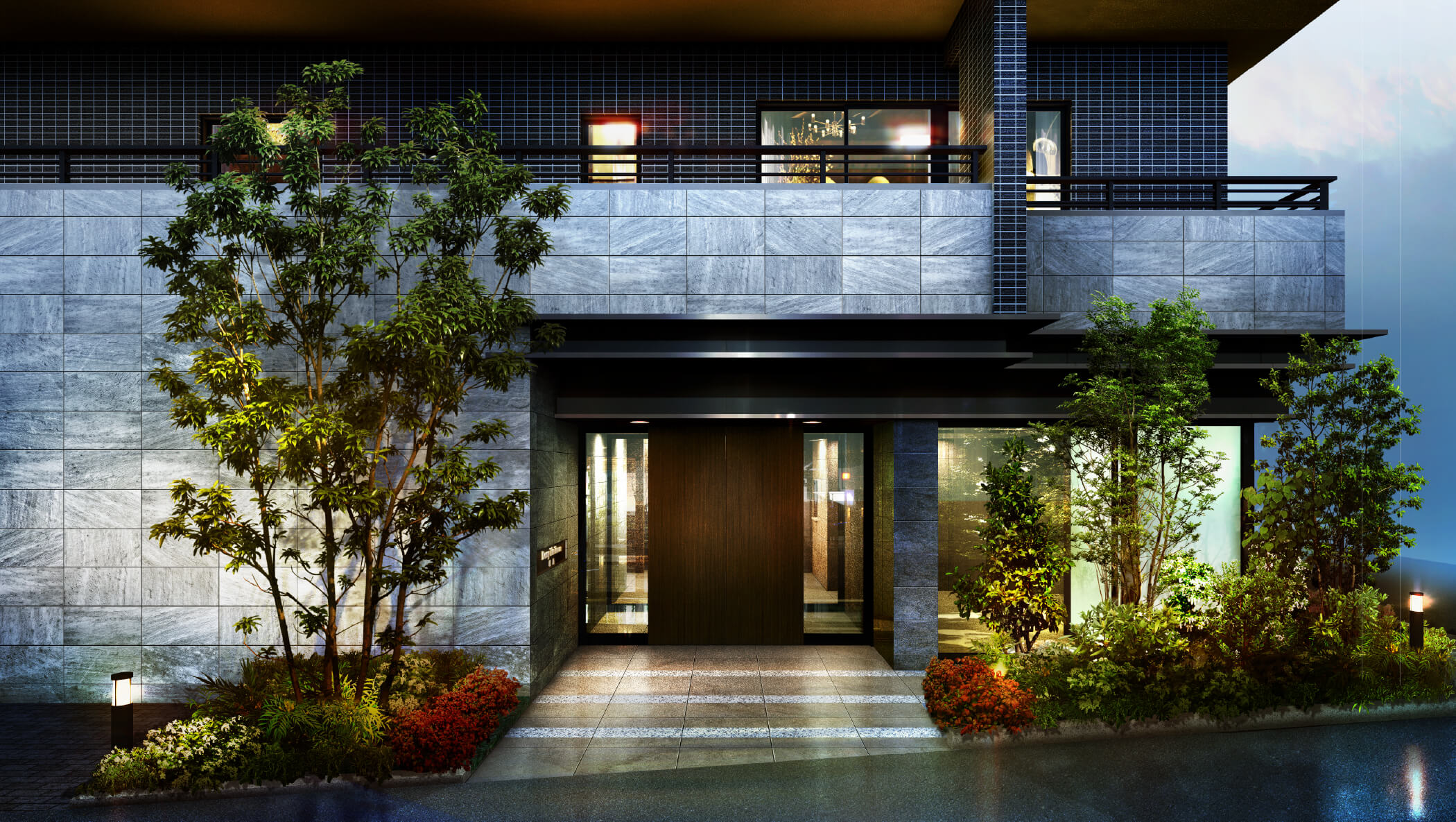 エントランスは基壇部壁面の石目調大判グレータイルが重厚な表情を演出。