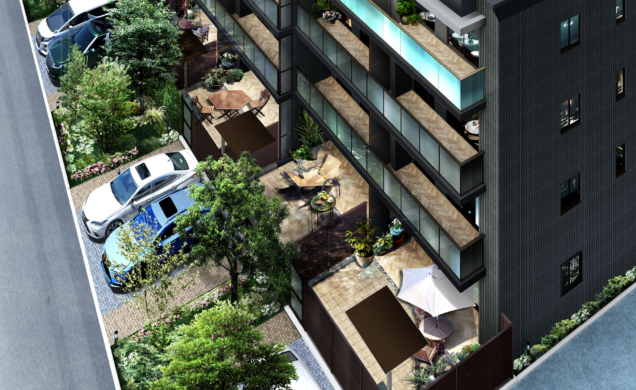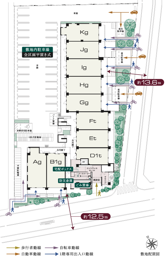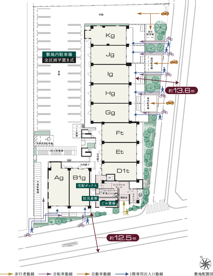 1階住戸には専用庭に加え、専用駐車場とサイクルポート、さらに専用出口も設けた特別プランをご用意。