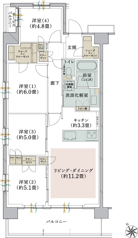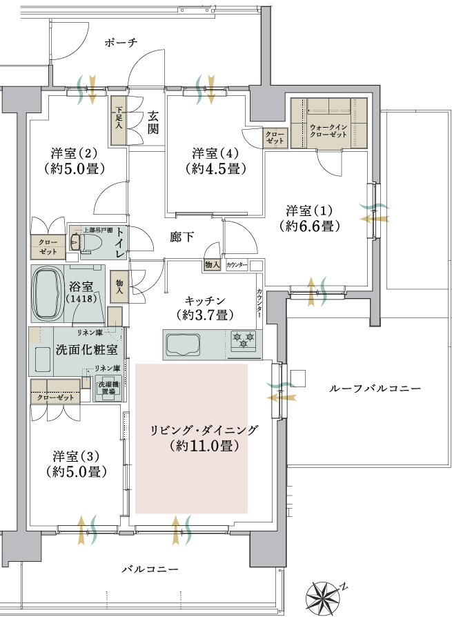 開放的な4LDK南西3面角住戸プラン。 - ウォークインクローゼットに加え、
